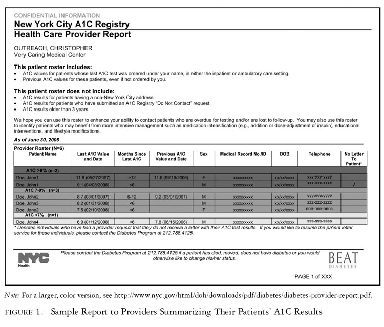 Disease registries can improve outcomes in people with chronic conditions (Bodenheimer, Wagner, and Grumbach 2002a, 2002b; Gudbjörnsdottir et al. 2003; Kupersmith et al. 2007; Larsen, Cannon, and Towner 2003; Tsai et al. 2005). Registries provide a mechanism by which providers can identify individuals in greatest need of follow-up or referral and also monitor disease indicators in their patient population over time. In New York City, few health care providers have such systems in place. The department’s position was that a population-based A1C registry could fill a critical gap in the health care system’s infrastructure until such innovations as electronic medical records with a registry function were more widely adopted, enabling providers to monitor and improve diabetes care.