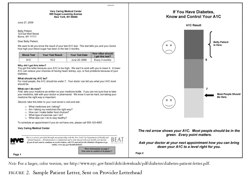 The department gives these facilities printed materials about the letter service, including the right to opt out, which can be displayed in patient care areas. Patients may refuse this service even before they receive a letter, by contacting the department by phone, post, or online using a web-based form (New York City Department of Health and Mental Hygiene 2009a). Those who opt out will not receive letters, and their results will not be listed on the provider or facility rosters. Because some individuals who might benefit from outreach may be excluded if their providers do not participate in the program, the department is also considering sending letters directly to patients whose last A1C was >9 percent and who have not had a subsequent test in twelve months and may no longer be in care.