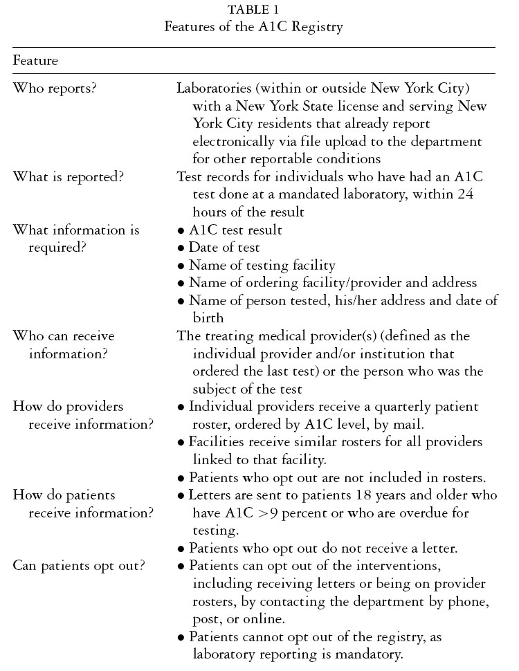 Conclusions: Mandatory reporting has proven successful in helping combat other major epidemics. New York City’s A1C Registry activities combine both traditional and novel public health approaches to reduce the burden of an epidemic chronic disease, diabetes. Despite criticism that mandatory reporting compromises individuals’ right to privacy without clear benefit, the early feedback has been positive and suggests that the benefits will outweigh the potential harms. Further evaluation will provide additional information that other local health jurisdictions may use in designing their strategies to address chronic disease.