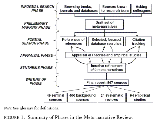 We identified seminal sources (often books) in each meta-narrative by asking what were cited as key original and scholarly contributions by other researchers in the same tradition. From these, we extracted the concepts, theories, and preferred methods that formed the criteria for rigor in each meta-narrative, and we used these to guide our appraisal of empirical studies. We gave great weight to studies that had been flagged as “high quality” by other scholars in a tradition, but because the literature included a wide range of different paradigms, perspectives, and study designs, we did not use a formal quality scoring system. In a synthesis phase, we compared and contrasted the different meta-narratives and exposed tensions and paradoxes, and we sought explanations for these in terms of how researchers had conceptualized the world and chosen to explore it.