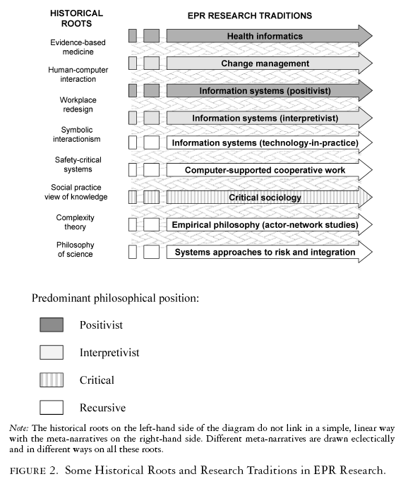 Health (or medical) informatics is the application of computers to clinical work, and health information systems (HIS) research is the study of the systems that support such work (Chiasson et al. 2006). This predominantly positivist tradition was developed jointly by doctors with an interest in computers and computer scientists with an interest in medicine (Gardner et al. 2009). The tradition is rooted in quantitative approaches and came to be strongly influenced by the ideas and values of EBM, with an emphasis on experimental studies; the preferred design is the RCT. Much (though not all) of health informatics has assumed that the benefits of a well-designed EPR with built-in “evidence-based” decision support are intrinsic and self-evident. For example, the EPR reduces legibility errors and hence makes prescribing safer. The key challenge was seen as getting the design right, implementing the technology, and ensuring that clinicians used it. Although health informatics has a large literature on technical design, it is separate from the literature on the implementation and use of such systems in organizations. In the latter literature, at least until recently, neither the technology nor its social context was considered in depth. Empirical studies of “the EPR” (sometimes a reified concept) were grouped together by systematic reviewers in meta-analyses, as were studies of “computerized decision support.”