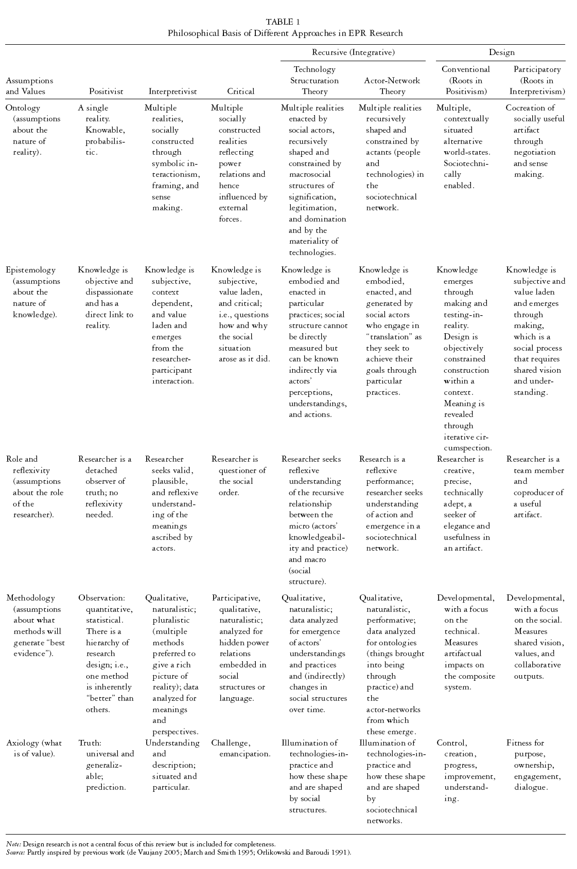 We found a complex and heterogeneous literature characterized by diverse philosophical assumptions about the nature of reality (ontology), how that reality might be known (epistemology), and the preferred research approaches and study designs (methodology). Adapting and extending previous taxonomies (de Vaujany 2005; Orlikowski and Baroudi 1991), we identified four main philosophical positions: