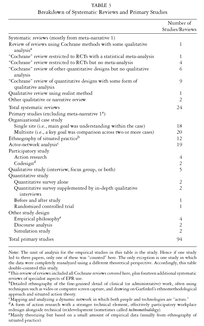 The ninety-four primary studies (described in 129 papers) outside the health informatics literature were philosophically pluralist, with 14 percent positivist, 19 percent interpretivist, 22 percent critical, and 55 percent recursive. As table 3 shows, they also were methodologically diverse, most with different types of case studies. In all, 16 percent of the sources included in our review (excluding background references) came from searching electronic databases, 43 percent from pursuing references of references, and 16 percent from citation tracking (mostly using Google Scholar to identify which subsequent papers had cited a seminal early publication). In addition, 16 percent of sources were already known to our team; 5 percent came from our social networks (asking colleagues if they knew of relevant papers); and 5 percent were serendipitous (finding a relevant paper when looking for something else).