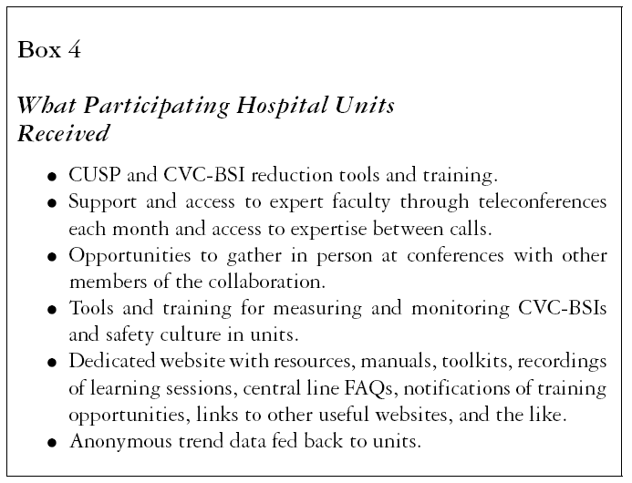 2. Creating a Networked Community. Once they had joined the project, the ICUs were asked to collect baseline CVC-BSI and VAP data and to administer to their staff a safety attitudes survey, as specified in the original protocol. The protocol also stipulated participation in education and meetings, which took more specific shape as the program proceeded. Education involved “immersion” coaching, including weekly teleconferences for six to eight weeks with hundreds of callers from the participating hospitals. The coaching gave the participants content information on measurement and the CUSP program (see box 3) and explained the technical interventions. After five months, a residential two-day workshop was held to build rapport within teams and between participating teams and the project team, and to launch the technical interventions. The ICUs then began to submit monthly data to the project team and to implement the technical interventions. The monthly teleconferences and face-to-face workshops at six-month intervals continued for the duration of the program (see box 4), but again, their form evolved over time. These calls delivered the information necessary to carry out the project; provided mentorship on methods for facilitating local change, including identifying and resolving common barriers through theoretical and experience-based strategies; engaged the project team with the participating centers and the centers with one another; and offered encouragement by sharing success stories. The teleconferences were recorded and made available on CDs, and a toolkit of materials to support the implementation of the intervention was distributed.