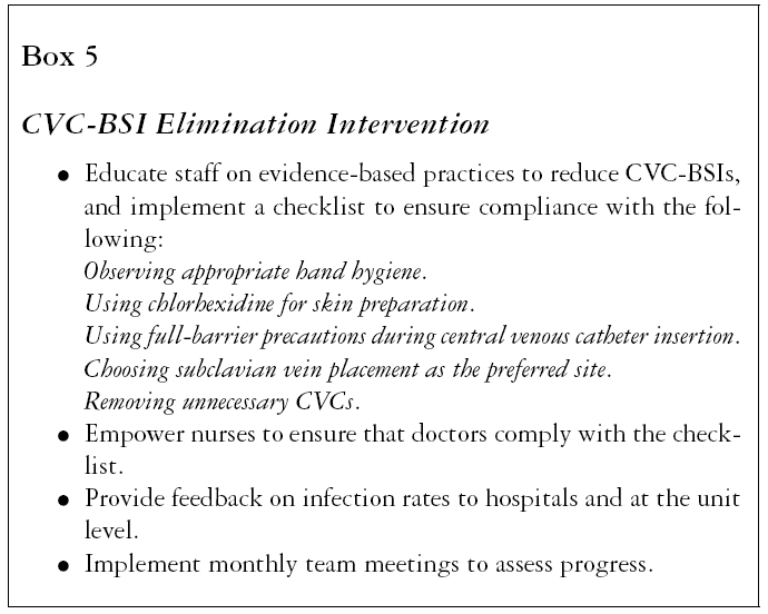 As specified in the project protocol, the Michigan program asked that participating units devise and use a checklist of the five practices related to CVC insertion and management (see box 5) that were known to reduce the risk of infection. It further asked that every CVC insertion (a procedure carried out by a doctor) be witnessed by a nurse who would record the doctor’s compliance with the checklist requirements, and stop the insertion if the checklist was not followed. At its simplest, the checklist was a prompt to repair any lapses in the five steps. But confining an understanding of how the checklist works to this simple, though important, role risks a serious misunderstanding. Our updating of the program theory enabled us to recognize that the checklist’s social functions extended to a greater contribution to the process in which the actions prescribed by the checklist were accepted and “taken for granted” as the right thing to do: the checklist functioned as a device for social control. It made visible the discrepancies between actual practice and “ideal practice,” directing attention to those areas of practice that required attention, and changed the role obligations of the nurse. Furthermore, the use of a locally adapted checklist supported by a strong evidence base provided a “safe space” for ICU workers to develop and practice team behaviors and accept collective responsibility for their outcomes. Because the evidence base supporting the intervention was very strong, the nurses felt safe in speaking up, thereby reducing the risk that they would be criticized.