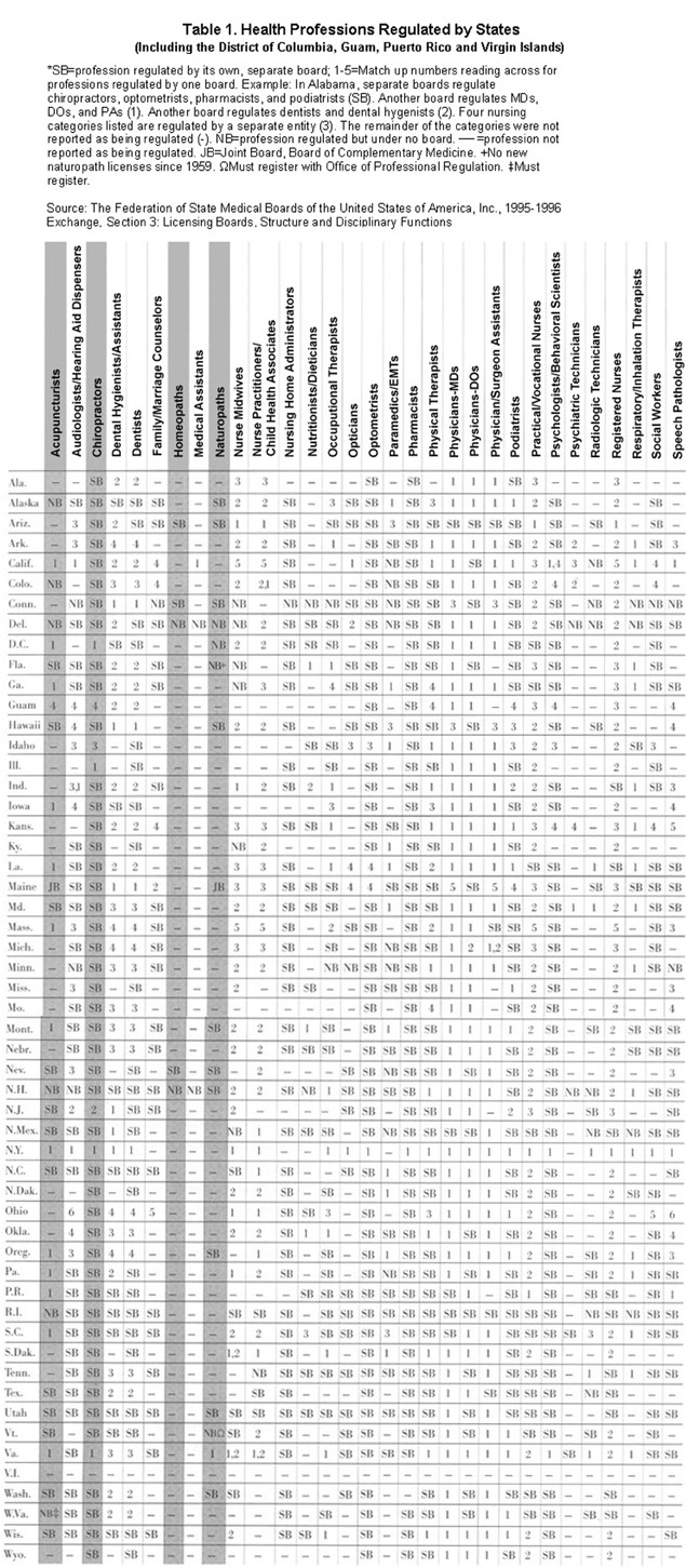 State medical boards are accountable for regulating professions that offer health care, including alternative therapies. Many of these boards operate on the basis of laws passed decades ago. Many operate on a financial base that is too small to permit them to oversee fully the safety and effectiveness of the care offered by licensed professionals. Moreover, many boards have inherited a reputation for protecting professions rather than the public.