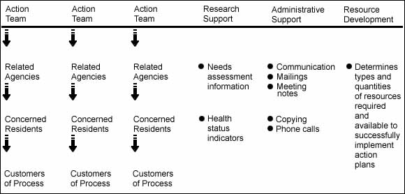 This model also embraces an adherence to guiding principles and manages itself by forming committees to aid the task groups in implementing their action plans (e.g., a funding committee to raise money, a public relations committee to build public awareness, and a program evaluation committee to access additional resources and to serve as program evaluation consultants).