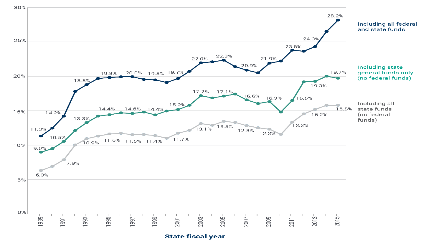 Figure One. Medicaid’s Share of State Budgets Including and Excluding Federal Funds, SFYs 1989-2015