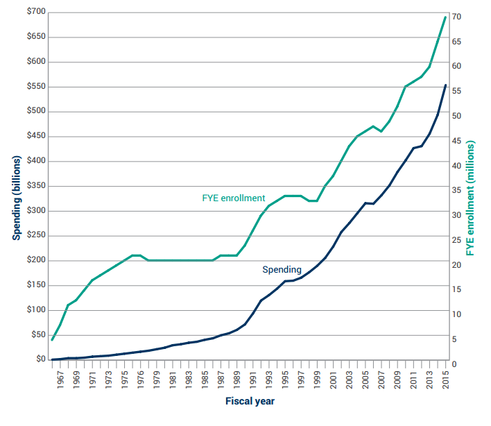 Figure Two. Medicaid Enrollment and Spending, FYs 1966–2015