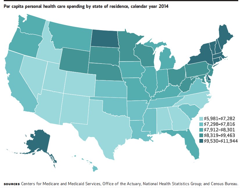 One way to examine health care spending is by state. States have widely different population characteristics, political cultures, and economies. How do these affect underlying health care cost trends? A report released June 14 in Health Affairs looks at total health care spending per person by state from 1991 to 2014 and yields some very interesting findings. Among them: