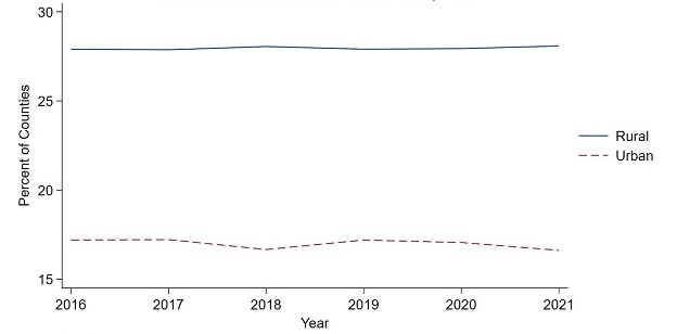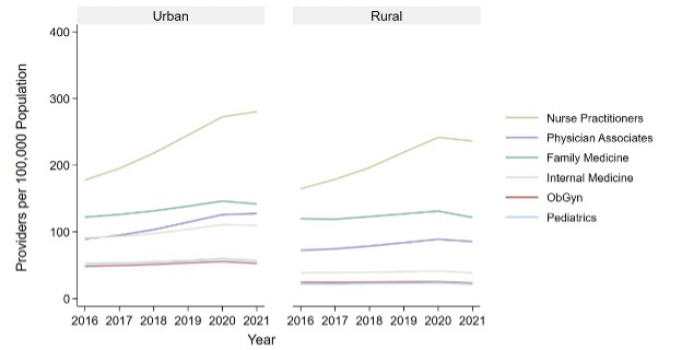 Data from the Tracker is consistent with other research documenting substantial rural workforce challenges. To assess local health workforce, we used Medicaid participation among primary care clinicians as a proxy for supply. Pairing this with county-level Medicaid enrollment, we calculated provider-to-population ratios, which account for differences in population density. Our analysis revealed a persistent disparity: from 2016 to 2021, across every specialty, rural counties had significantly fewer Medicaid-participating primary care providers per 100,000 enrollees than their urban counterparts (Figure 1). Further, these ratios remained fairly stable by specialty and profession, with the exception of nurse practitioners (NPs), whose numbers have increased from 165 per 100,00 population in 2016 to 236 in 2021 in rural areas (Figure 2). We also found that a significantly higher percentage of rural counties are primarily served by NPs and physician associates (PAs).