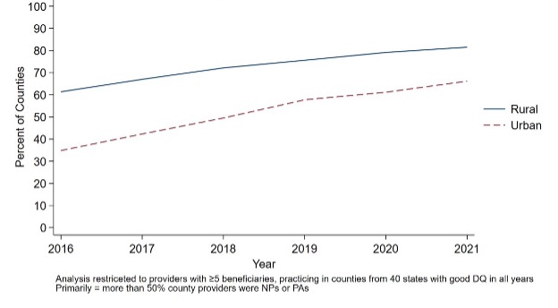 * Authors’ analysis using data from the Medicaid tracker** Analysis restricted to providers with ≥ 5 Medicaid beneficiaries, practicing in counties from 40 states with good data quality in all years*** Primarily = more than 50% county providers were nurse practitioners (NPs) or Physician Associates (PAs)
