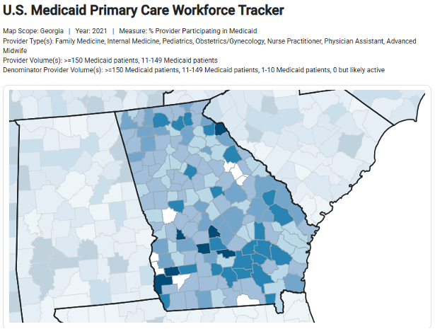 The Tracker offers an interactive map that allows the users to visualize the primary care workforce providing health care to individuals with Medicaid. It provides states with the ability to benchmark their Medicaid primary care workforce against other states, assess participation across professions and specialties, map county-level distribution, and track trends in workforce supply over time.