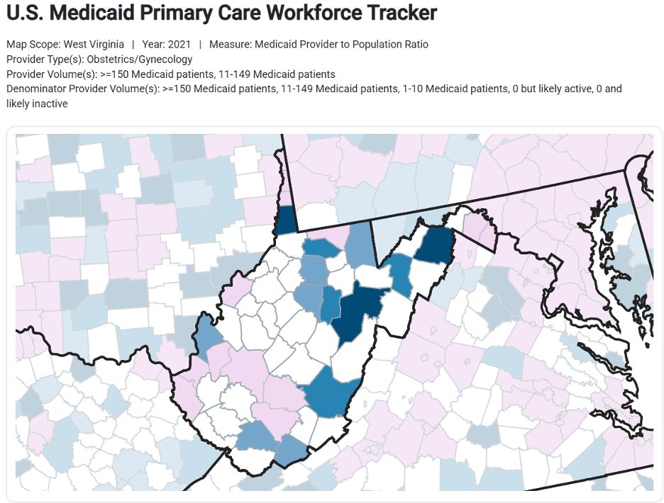Some counties lack specific specialties, such as OBGYNs. In West Virginia, for example, there are large clusters of counties with no maternal care providers. By searching for counties with OBGYNs or midwives, we can see 14 adjacent counties in West Virginia that have no OBGYNs or midwives, suggesting an urgent need to investigate, first, whether there are women’s health care vacancies in those counties, and then to target investments to either creating jobs and/or incentivizing professionals to move to those areas (Figure 5).