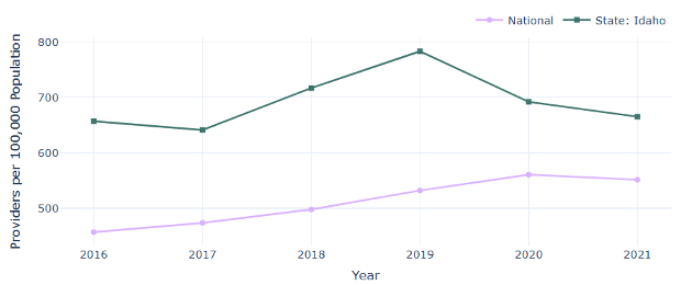 Lastly, longitudinal analyses can highlight counties and provider types that are falling or increasing faster than the state or national average. In Idaho, for example, while the primary care provider-to-population ratio is higher than the national average, there was a downward turn from 2019 to 2021, even as the national trend continued to rise (Figure 6). Drilling down, the Tracker allows us to identify which counties and professions are driving the decline. States will need to investigate causes of such declines, but one explanation may be rural hospital closures, making it even more important to enhance the primary care infrastructure, such as community health centers and school-based clinics, in addition to developing the other strategies mentioned earlier.