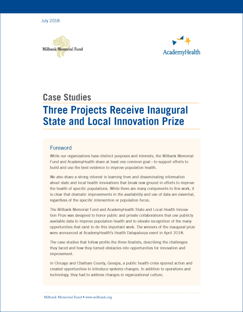 Meet the winners of the inaugural Milbank Memorial Fund and AcademyHealth State and Local Innovation Prize, developed to recognize state and local efforts to leverage data to improve the health of populations and the performance of health systems.