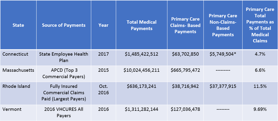 Working from the common set of primary care spending measures, each state selected their key data elements and applied them to their own state data sets. A comparative look at primary care payments in four New England states is provided in the table below.