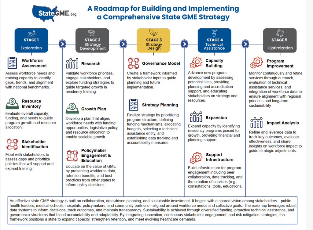 States across the nation are facing physician workforce shortages, particularly in rural and underserved communities. To address these shortages, states are increasingly embracing a “grow your own” graduate medical education (GME) strategy as federal policies fall short of meeting their needs. However, without a guiding framework, states often rely on ad hoc approaches to engage key stakeholders; fund GME development, expansion, and sustainability; and assess the impact of their investments. To address the challenges states face, we developed the Roadmap for Building and Implementing a Comprehensive State GME Strategy, an evidence-based framework that organizes a GME growth strategy into five iterative stages: exploration, strategy development, strategy design, technical assistance, and optimization. The roadmap draws on previous research, the experience of our GME technical assistance centers, and collaborative work with numerous states engaged in developing statewide strategies.