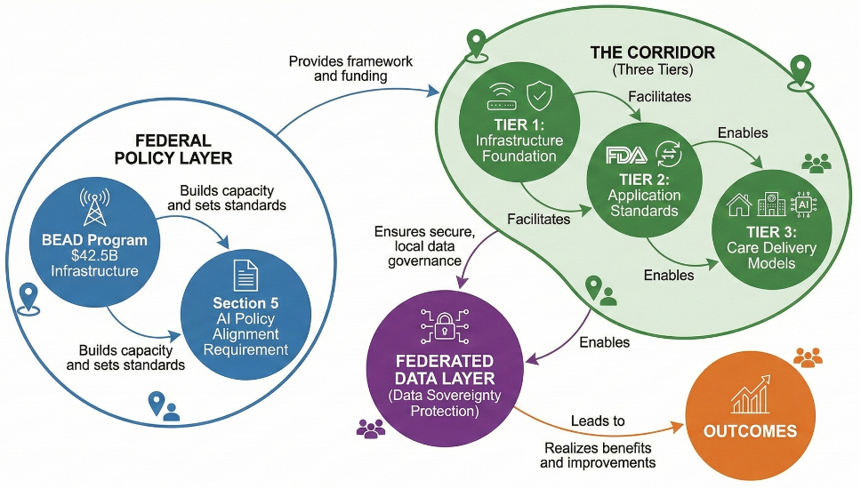 The Corridor would operate through three implementation tiers. The infrastructure foundation would establish connectivity standards specifically designed for clinical AI in workforce-constrained settings. Current BEAD requirements specify minimum speeds reflecting general consumer access rather than clinical application requirements. The Corridor framework would require enhanced specifications for health facilities, including security and privacy requirements embedded at the infrastructure level with network segmentation, strong encryption, and robust authentication.