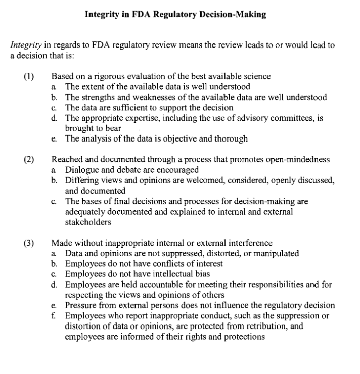 An alternative concept to “gold standard science” is integrity in scientific decision making. Rather than suggest there is a single “gold standard” answer to every policy question, an approach centered on integrity calls for the policy process itself to be trusted. In 2009, after a controversy about the review of a medical device, several senior leaders of the FDA developed a three-part definition of integrity in public health policy decisions that has relevance and resonance today.